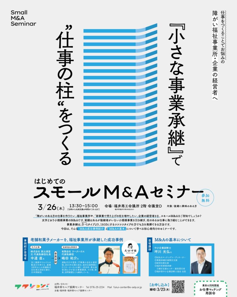 今回は、「老舗和菓子メーカーを福祉事業所が承継した成功事例」と「M&Aの基本」について学べる初心者向けのセミナーです。
